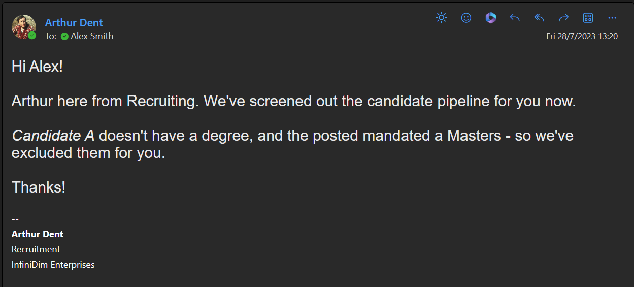 Hi Alex! Arthur here from Recruiting. We’ve screened out the candidate pipeline for you now. Candidate A doesn’t have a degree, and this role requires a Masters - so we’ve excluded them for you. Thanks!